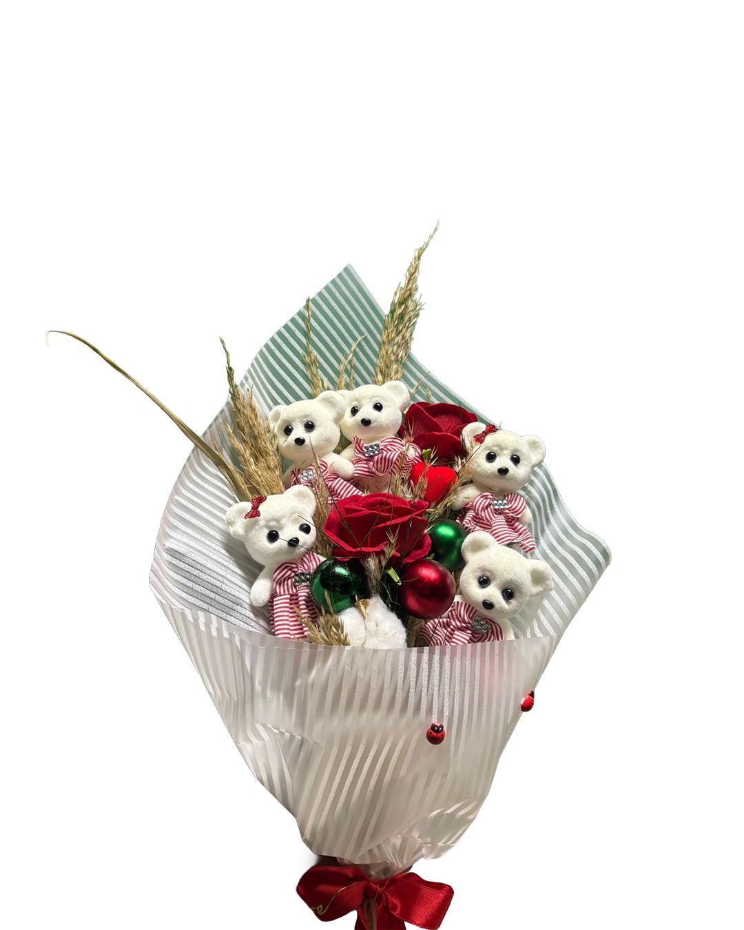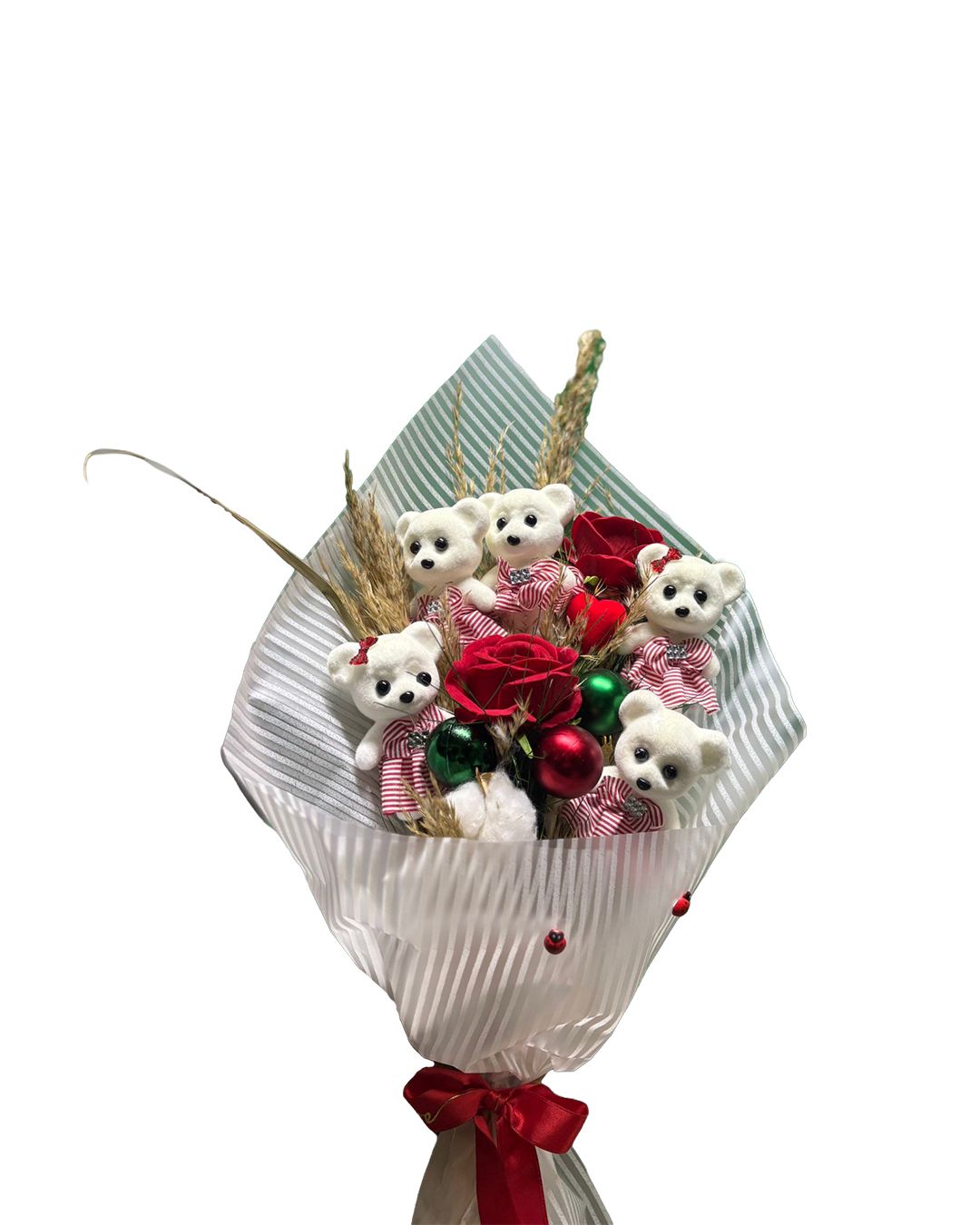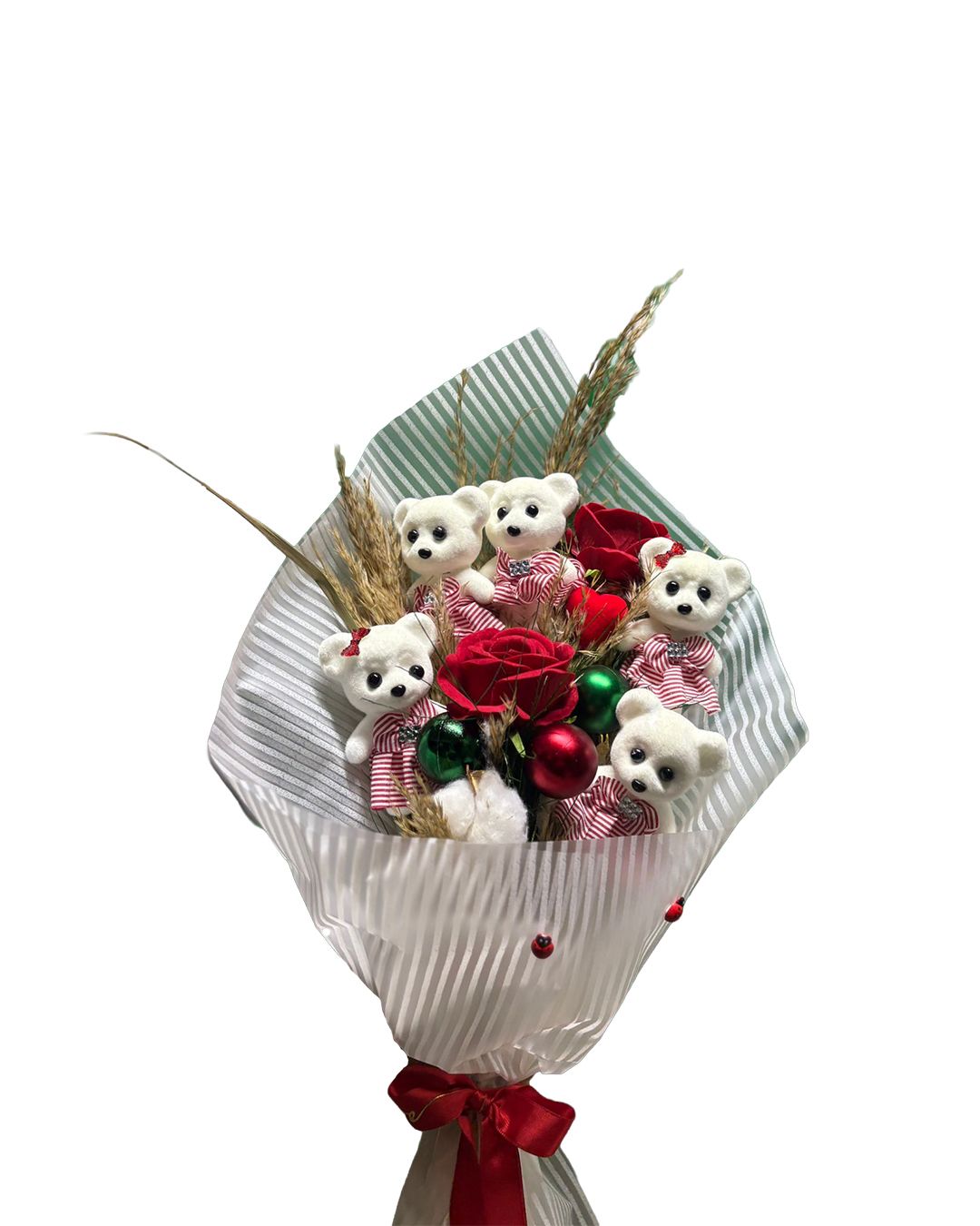 Sevginizi tek bir hediye ile anlatmak istiyorsanız, bu özel tasarım ayıcıklı kırmızı gül buketi tam size göre. Kırmızı güllerin romantik ve anlamlı duruşu; sevimli ayıcık figürleri, doğal başak detayları ve yılbaşı ruhunu yansıtan dekoratif süslerle bir araya gelerek benzersiz bir aranjman oluşturur.